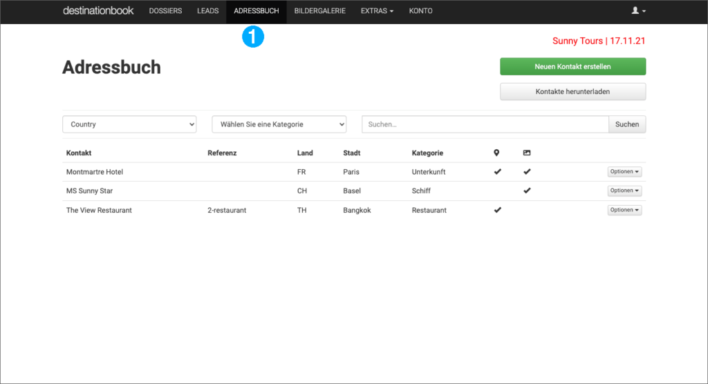 Um einen Kontakt zu erstellen, klicken Sie auf «Neuen Kontakt erstellen» ➋. Um einen Kontakt zu bearbeiten oder zu löschen, wählen Sie «Optionen» ➌.