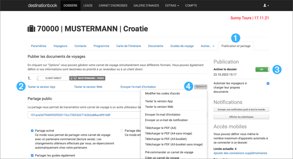 Si vos clients désirent obtenir un progamme de voyage en version papier, vous avez à tout moment la possibilité de générer différents PDF prêts pour l’impression ➍.